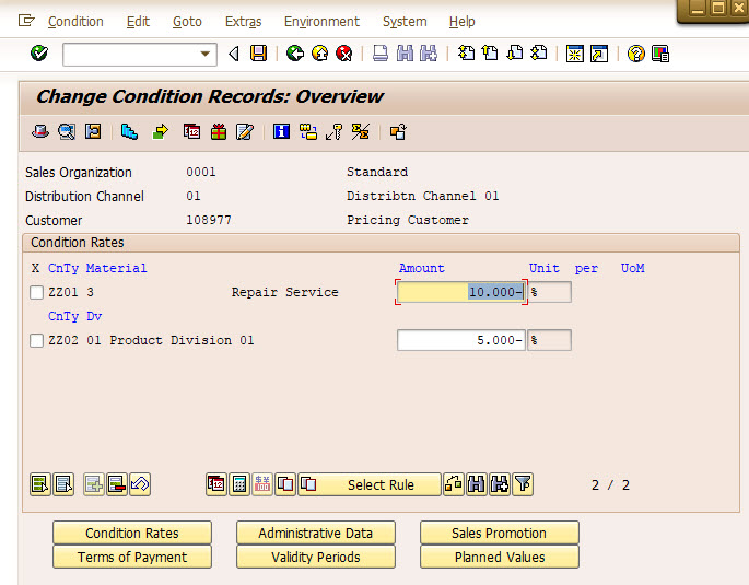 A customer specific discount is offered to the same customer, but for only 5%, using condition type ZZ02.