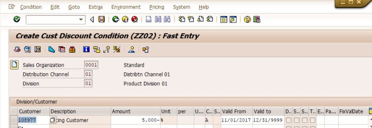 A customer / material discount is created for 10% using condition type ZZ01.