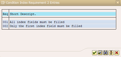In the example above condition type ZZ01 would not have been visible in condition index 2 if requirement 001 was selected instead of requirement 002.